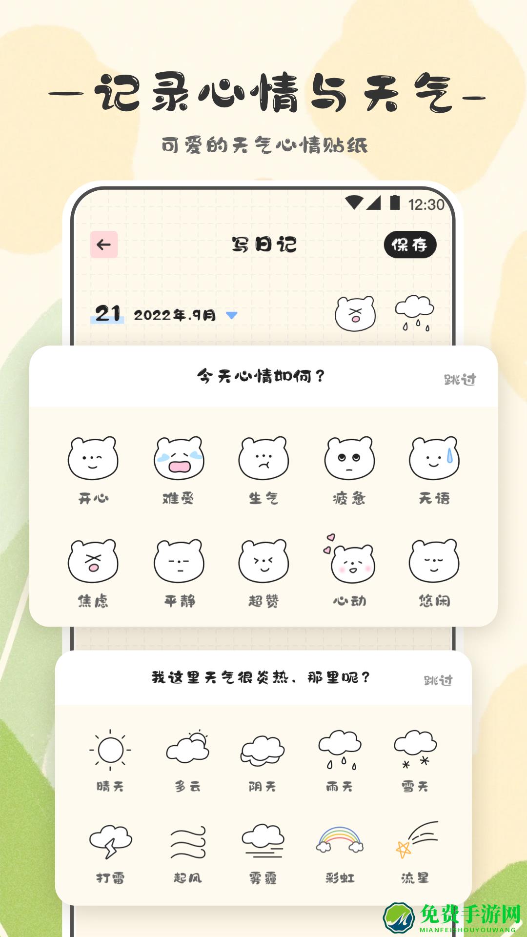 5、心情贴纸:丰富多样的心情贴纸,自由配搭,让日记更具表现力,展现丰富的情感层面。