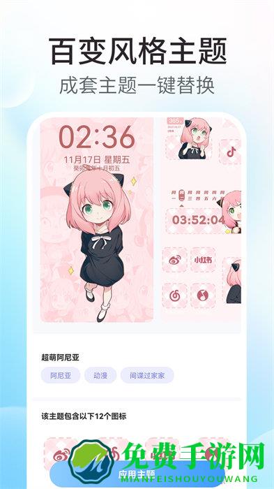 主题小组件可以美化你的手机桌面,无论是修改软件的图标还是添加各种小插件都是可以的,你可以自由设置小插件然后组合在一起,打造个性化的桌面。内置的小插件非常丰富,各种功能应有尽有,还可以自主设置背景图片等内容,欢迎有需要的朋友下载使用!