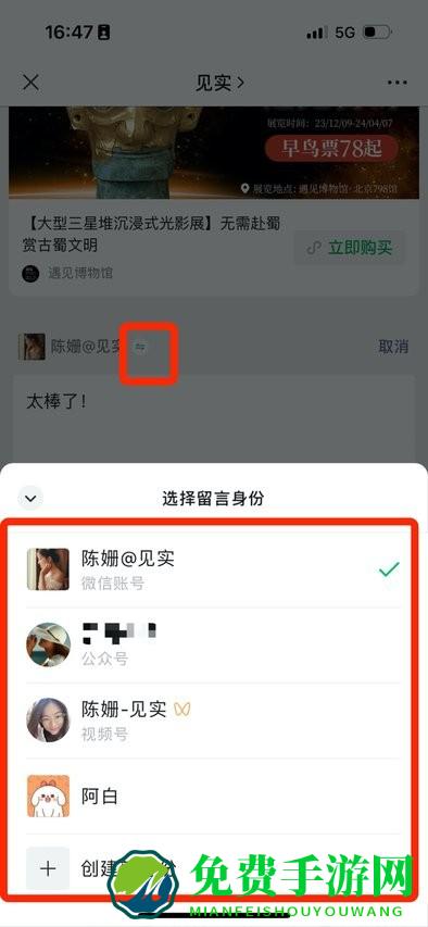 用户在公众号留言时,点击昵称旁边的切换按钮,就可以进行身份切换,留言身份可以选择微信账号、公众号、视频号,以及可以创建新身份。