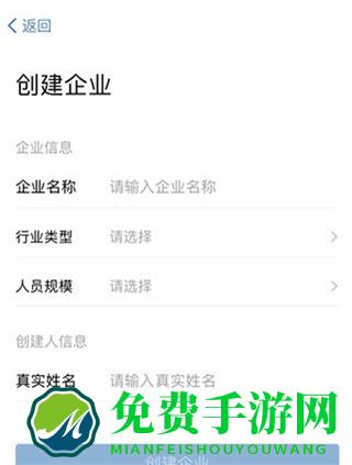 3、进入创建企业页面,输入企业名称、行业类型、人员规模以及真实姓名,然后点击创建企业;