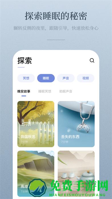 专业睡眠冥想练习,让你在引导师疗愈的声音里,白噪音的流水声,海浪声,风声里,沉沉睡去。
