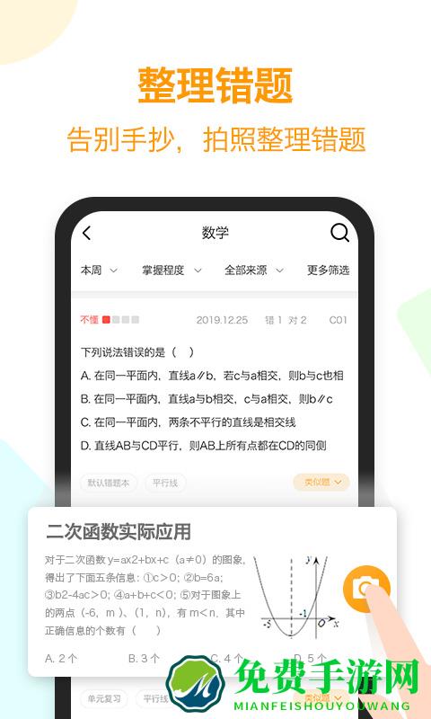 还在手抄错题?还在把试卷剪个稀巴烂?out啦!拍个照一键导出错题本,整理错题so easy!完美的错题本格式、合理的科目年级分类、优化过的错题图片,让整理错题本不再是个鸡肋,好习惯铸就好成绩,赶紧来免费手游网下载橙果错题本app试试b吧!