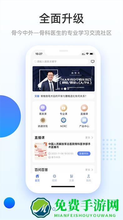 骨今中外手机版是一款健康医疗类应用,专注骨科的相关治疗和恢复,为患者提供最前沿的骨科资讯,骨科会议模块实时同步全国骨科会议,最新通知,最新日程,一目了然,还可以在线咨询健康问题,方便日常就医,欢迎有需要的朋友在免费手游网下载!