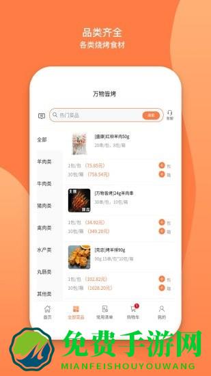 1、自动推送热门商品,都是顾客去烧烤店必点的烧烤食材,能够一键操作将其加入购物车。