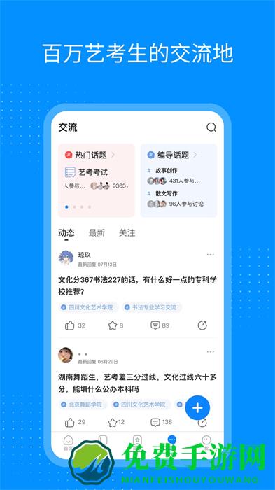艺考生app是为广大艺术考生精心打造的一款艺考资讯培训应用,你可以在这里强化自己的艺术技能,有超多的学长学姐会在这里帮助你,解答你各类疑惑和难题,帮助您完成通过艺术考试,你可以在这里轻松的学习到很多的技巧、认识很多的朋友。