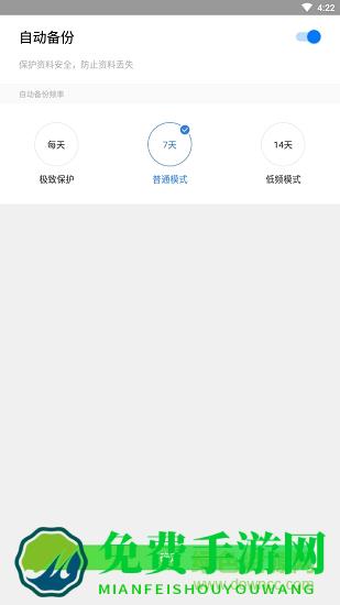 点击主界面右上角“盾牌标识”按钮,进入“自动备份”,根据个人需求设置并开启相关权限后,即可开启自动备份。建议设置每天或7天自动备份,及时备份到云端可避免数据丢失。