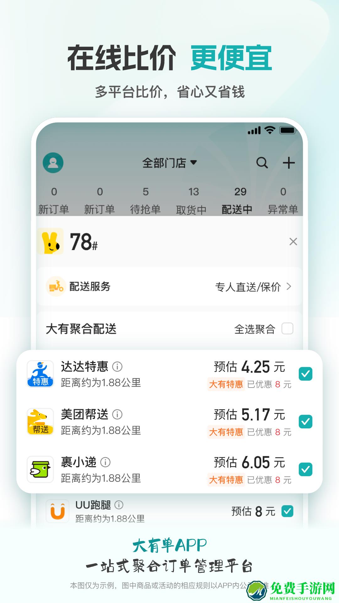 大有单是一套全渠道聚合订单管理&配送服务系统,聚合多家电商渠道和多家同城配送运力供应商,轻松管理美团、饿了么等电商渠道所有订单,一键发起多运力配送,全链路解决订单、库存、配送、运单、售后问题,打造门店管理、渠道运营、订单配送全链路商业闭环。