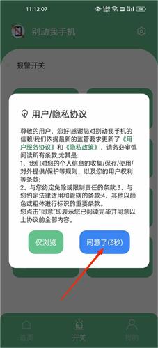 3.选择好后,需要一定的权限,大家点击同意用户隐私协议后,才能使用报警功能哦。
