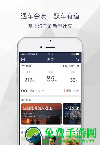 遇道app是一款非常好用的基于汽车的社交应用,不单单是能聊天交友,还能实时的了解你的爱车的情况,并且还能为你智能的分析出爱车的健康报告,更能查询你的爱车的过往维修记录,还在等什么?快来免费手游网下载吧!