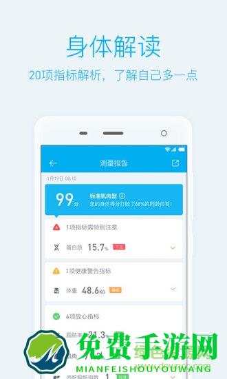 2.全新设计的测量报告,可以看到更丰富的身体指标解析和更详细的身体变化解读,还会根据测量结果为您推荐专属的训练视频哦,跟着教练动起来吧!