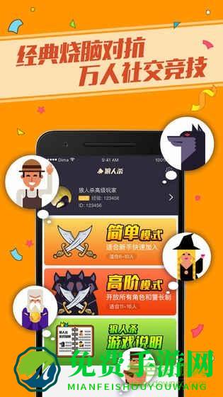 狼人杀九游版本是一款超火爆的“杀人游戏”,这款手机游戏玩法丰富多样,角色丰富,在这里你可以感受语言与逻辑的魅力,喜欢的话那就赶紧来免费手游网下载试玩吧!