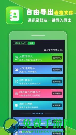 通讯录导入王是一款导出/导入pdf转换工具、通讯录工具,把excel格式的通讯录表格文件同步导入至本机或导出联系人表格文件分享至同事、好友、电脑等!适合业务联系人推广、备份换机、通讯录保存,可谓是通讯录必备的管理良品!