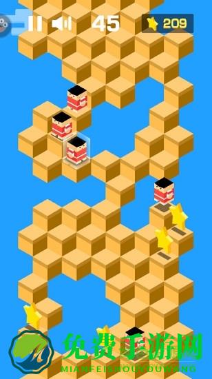 2、一定要跳到方块上,千万不要掉地上了,不然就只能重新开始游戏了呢。