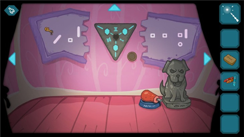 2、右转发现锅和柜子,钥匙打开柜子得到铃铛的一部分,装上铃铛引来狗雕塑,并在冰箱上发现三角、方块、圆代表的数字,对应窗帘的图案解得冰箱密码1245,转动开关