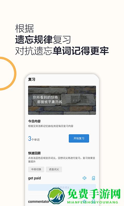 一个非常专业的在线辅导学习单词的软件,针对不同的学习情况寻找学习的技巧性把握,操作简单,页面清晰,方便用户进行功能的查找,一站式服务平台为你量身定制专属个人学习计划,随时随地都能开启学习模式,需要就赶紧来免费手游网下载吧!