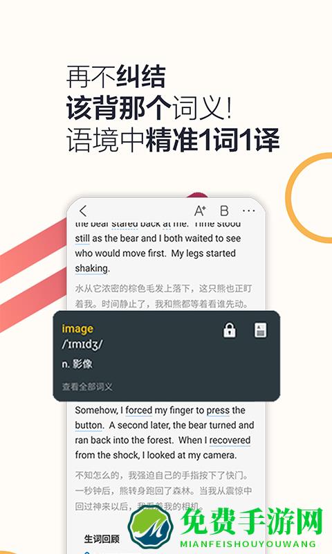 句子为学习的最小单位.点击生词,根据翻译提示尝试翻译句子.在语境中记词更符合语言学习规律.