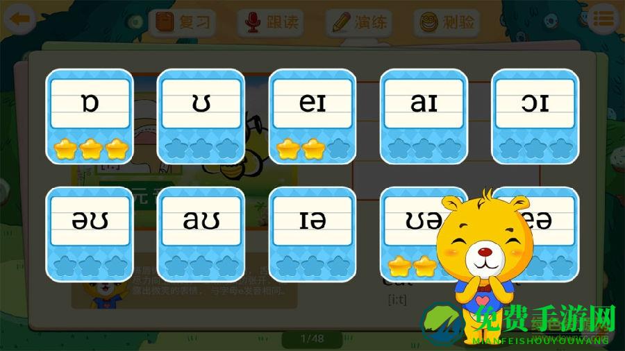 巴比智慧园国际音标是一款非常好用的国际音标app,以图文并茂的形式教孩子学音标,支持进行跟读、复习、演练、对比和测验,让孩子从小打好英语基础,欢迎有需要的朋友到免费手游网下载使用!