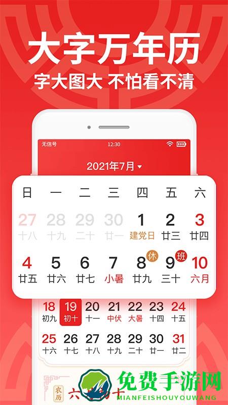鸿运万年历大字版app是专门给老人提供日历查看的软件,里面的字体都是非常的大,方便老人点进去查看,自大图也大,再也不用担心老人眼睛看不清了,操作也是非常的简单,方便老人使用。