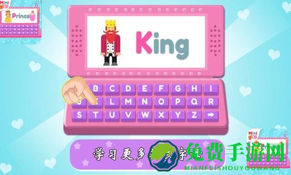 小宝宝梦想电脑使用键盘中字母的来教字母表以及英文单词,例如a代表盔甲,b代表蝴蝶,c代表马车,d代表衣服等。