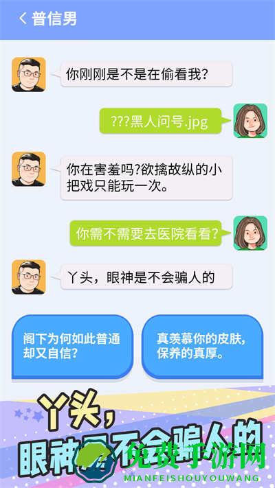 普信男模拟器游戏将会带来非常精彩的手机聊天游戏体验,在游戏中玩家可以真实的和女神聊天,玩家发出的信息都会有回复,可以选择不同的消息发送,游戏中会提供两个选项,玩家需要从中选择一个进行发送。