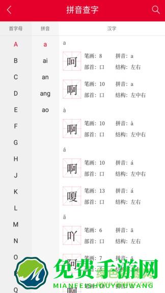 掌上汉语字典手机版是一款非常好用的安卓字典app,收录了丰富的汉字资源,支持按照拼音、部首、结构以及笔画来进行汉字的查找,每一个汉字都有详细的解释、拼音和笔顺等,让你全面的了解汉字,欢迎大家下载使用!