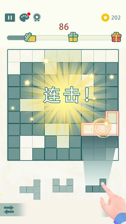 3、经典玩法,把方块拖到棋盘上拼接消除,消除华丽酷炫的特效,闪眼睛。