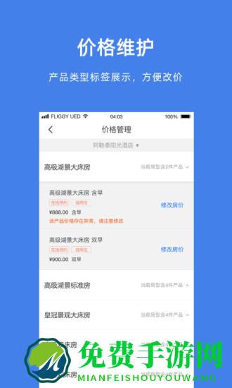 飞猪旅行商家版app手机客户端是专门为商家打造的一款后台管理软件,商家入驻之后可以在线接单、在线收款等等,酒店、汽车站等等各种商家都可以入驻,非常的方便实用,极大的提高了业绩!喜欢的朋友可以到免费手游网下载体验哦!