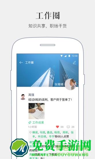 1、工作圈:分享观点、知识,掌握职场干货;标签分类,迅速找对组织;更有点赞、评论,随时互动探讨。