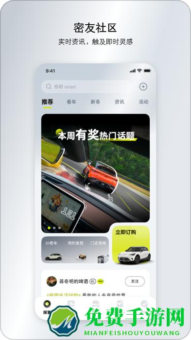 在smart汽车APP上可以获取最新最COOL的smart潮流资讯,参与smart丰富的社区活动,加入你感兴趣的smart社群和所有smart的朋友们探索充满潮趣与前卫的全新未来。