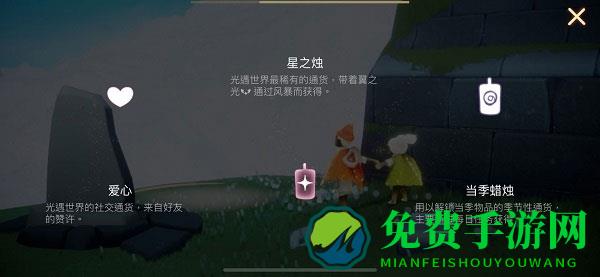 点击游戏界面的左上角可以看到我们拥有的蜡烛数量。从左到右依次是普通蜡烛、季节限定蜡烛、爱心。这3个是游戏中的货币。其他人赠送给自己蜡烛时,我们就可以获得爱心。