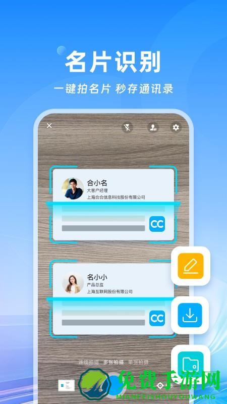 手机拍名片,瞬间精准识别,存入通讯录;支持一次拍摄多张名片,快速批量识别;支持识别16种语言名片、二维码名片,和邮件签名