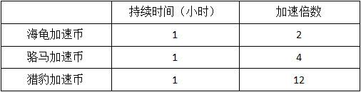 玩家点击进入商店,在生产界面的右边就可以看到加速选项。点进加速币选项之后,玩家就可以看到一共有3种加速币,分别是海龟加速币、骆马加速币和猎豹加速币。