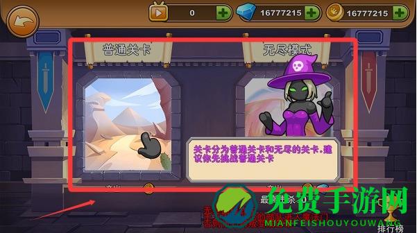 2、关卡分为普通关卡和无尽关卡,初始玩家建议选择普通关卡。