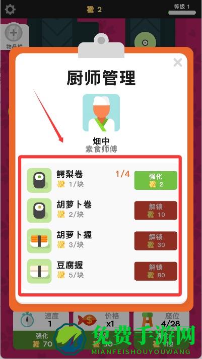 1、知名主厨解锁与升级体系,触及寿司界顶尖大师,通过提高厨师技能等级解锁全新菜谱,让餐厅实力快速提升。