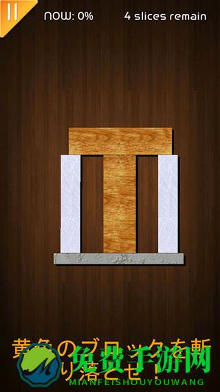 1、手指在屏幕上滑动,沿预想轨迹切开目标区域的木块,确保切割次数用到极致,剩余刀数少时需思考最优路径。