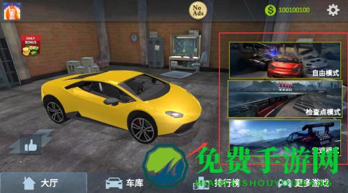 2、模式选择界面提供自由驾驶、计时挑战与多人竞速三种核心玩法,满足不同驾驶需求。