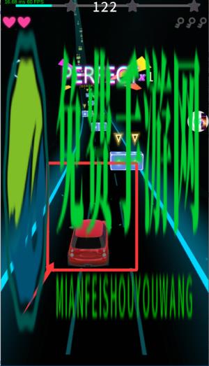 2、注意赛道上的音符方块,按照背景音乐的节拍撞击它们,连续精准操作可以积累连击奖励分数,同时解锁更多赛车技能。