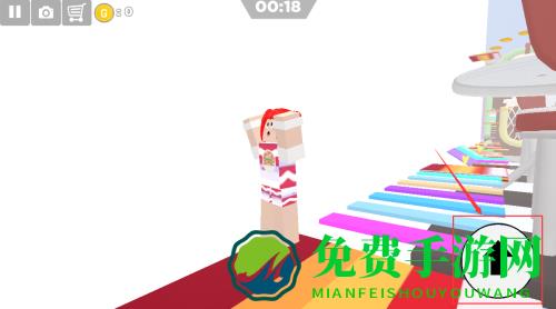 4、点击白色箭头,让角色跳跃彩色琴键道路。