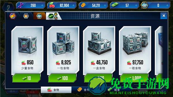 2、食物:恐龙升级资源。玩家可通过食物工厂生产、升级、现金购买等方式获得食物。当玩家达到相应等级后,更可升级食物工厂,提升食物产出量。