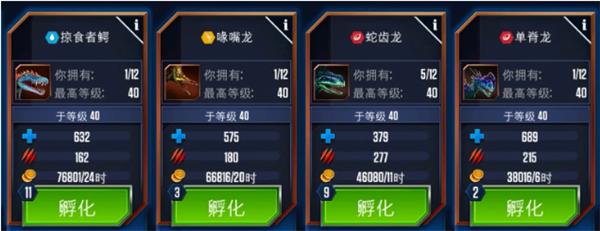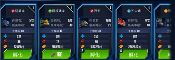 4、孵化所:每一只恐龙的诞生都必须经历一个孵化过程,游戏为玩家免费提供了一个免费孵化器,玩家花费现金可解锁更多孵化器,更快培育恐龙。