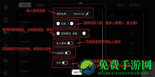 设置房间名称、玩家人数、游戏模式、是否为私人房间、对讲机、PVP等,然后点击“NEXT”;