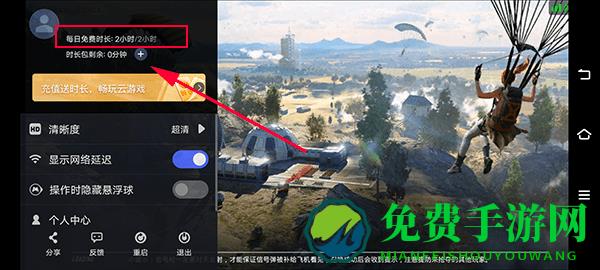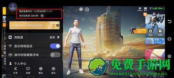 3、登录成功后,点击打开左侧漂浮窗我们可查看自己的游玩时间,下图所示加号可充值或免费领取游戏时长;