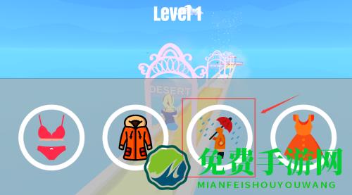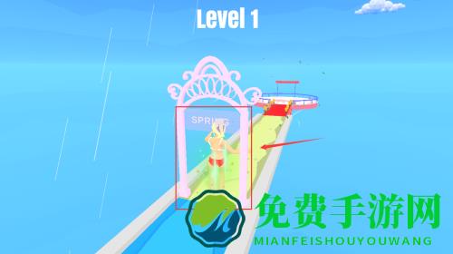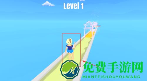 1、控制红框金发女孩,沿道路走向粉色拱门过关。