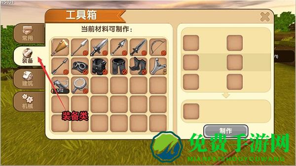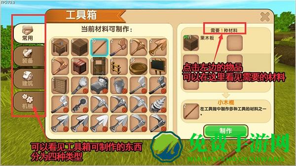 可以看见有很多可以通过工具箱来制作的东西,他们分为四种类型:常用、装备、建筑、机械。