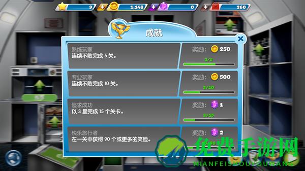 5、游戏采用了关卡的形式,当我们完成一个关卡后就会获得不同的奖励,这些金币奖励可以用于升级机舱内的各种设施,设备的升级不仅可以提高收入,还可以缩短等待制作的时间