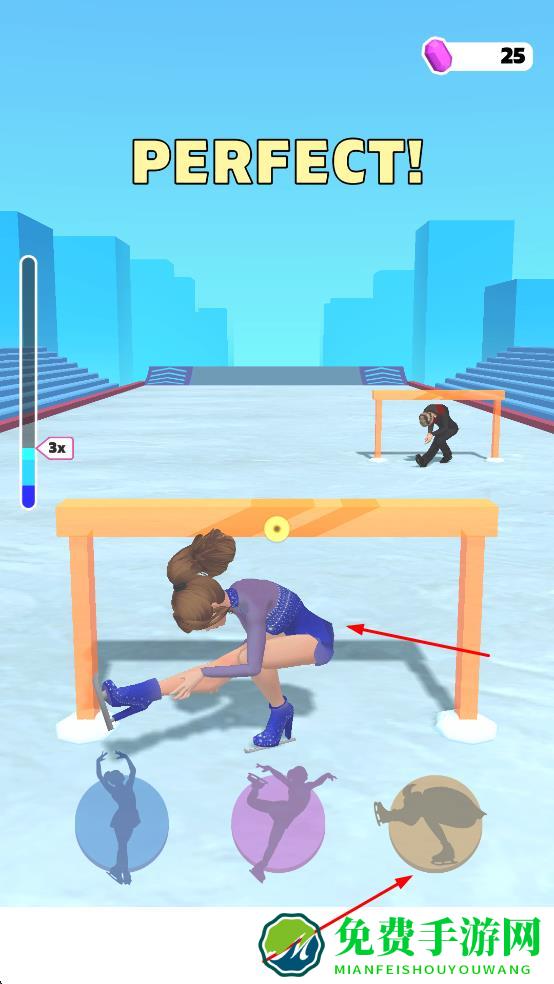 1、三种姿势灵活运用:提供三种滑冰姿势,玩家需灵活切换以应对不同关卡场景,从快速滑行到高难度转身,每种姿势都有其适用场景,合理运用能更顺利完成华丽动作。