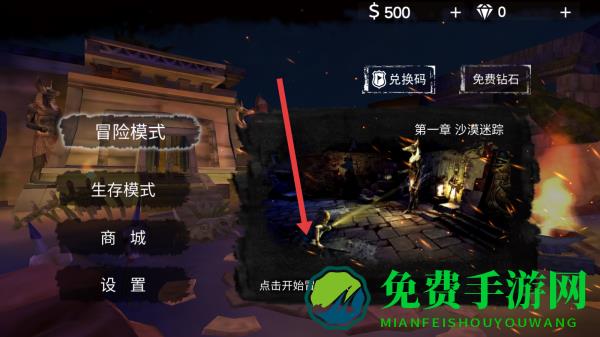 1、在游戏主界面,选择冒险模式第一章沙漠迷踪,通过点击开始冒险之旅,进入地宫场景探索。