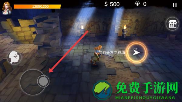 2、在地宫关卡,可以操控左下角虚拟摇杆,指挥角色向箭头方向移动,探索场景推进冒险进程。