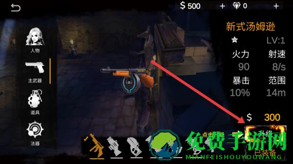 3、点击右侧商店进入武器界面,花费300金币点击新式汤姆逊的升级按钮,提升武器属性增强战斗能力。