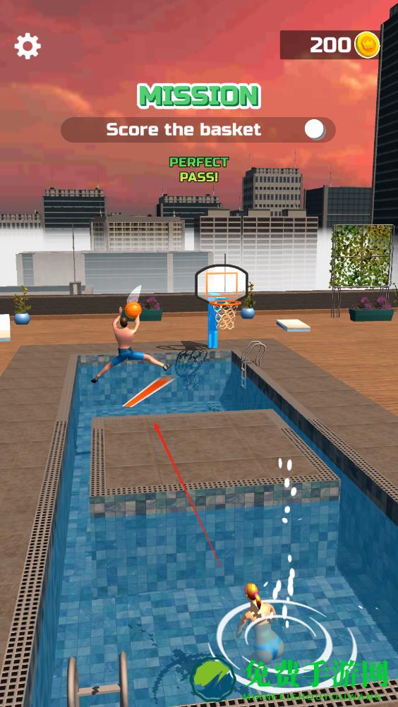1、画线操控与游泳移动:通过手指在屏幕上画线,控制角色在泳池中的游泳方向和速度,避开水中的障碍物,灵活调整位置以靠近投篮点,为投篮做好准备。